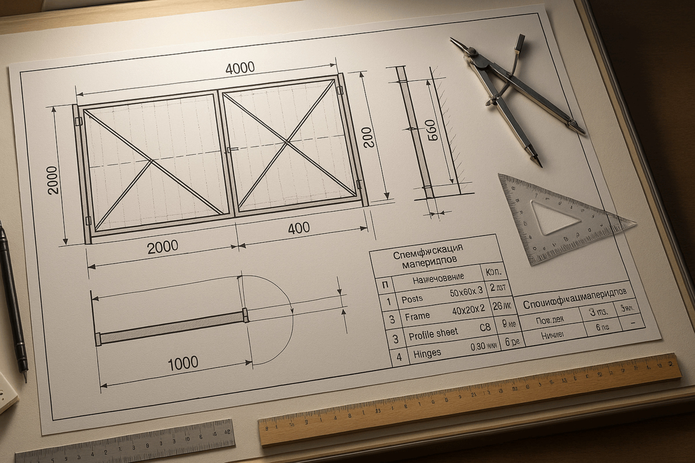 - Точный расчёт материалов. По чертежу вы посчитаете каждый метр трубы, каждый лист профнастила. Не придётся докупать в последний момент или хранить лишнее в гараже. Например, для распашных ворот 4×2 метра вам нужно ровно 18 метров профильной трубы 40×20 для каркаса. Без чертежа легко ошибиться на 3-5 метров — это уже 1500 рублей разницы.