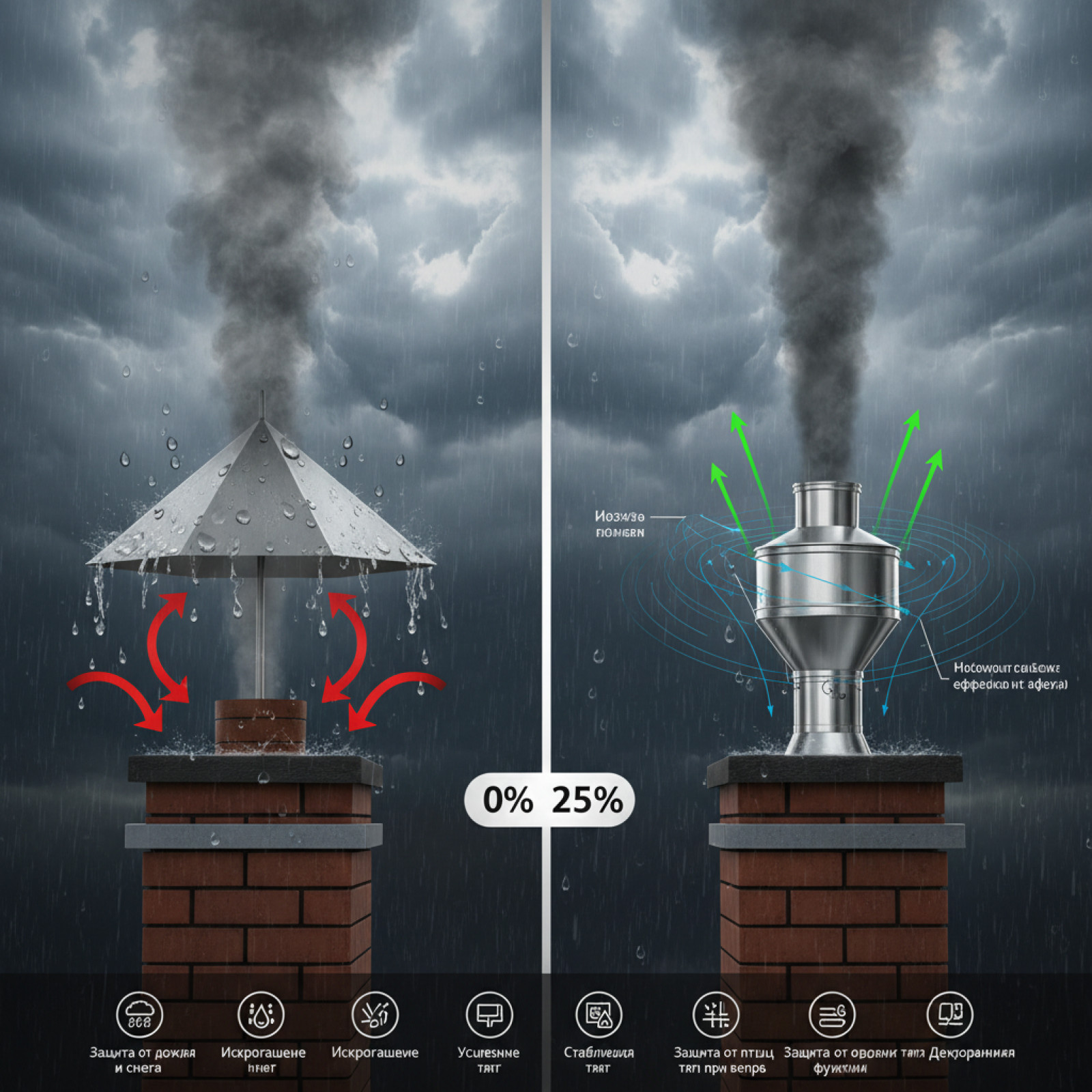 Качественный дефлектор на дымоход для увеличения тяги выполняет сразу несколько важных функций. Каждая из них критична для безопасной и эффективной работы отопительной системы.