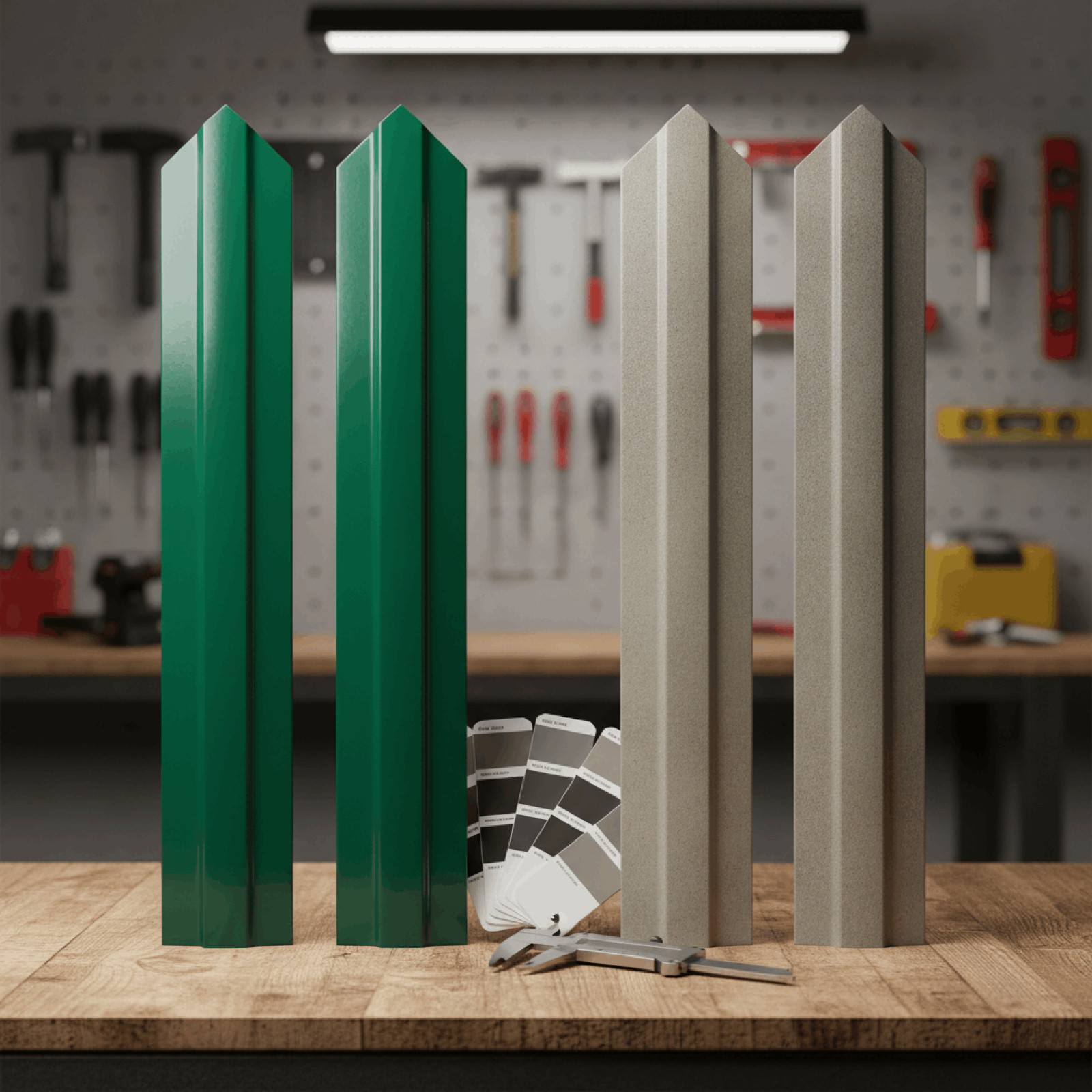 Покрытие и цвет — главное различие. Лицевая сторона покрыта полимерным слоем (полиэстер, пурал или другое покрытие) толщиной 25-35 микрон. Это даёт насыщенный цвет, защиту от ультрафиолета и коррозии. Обратная сторона у одностороннего штакетника покрыта только грунтом толщиной 5-7 микрон — серым или светло-бежевым.