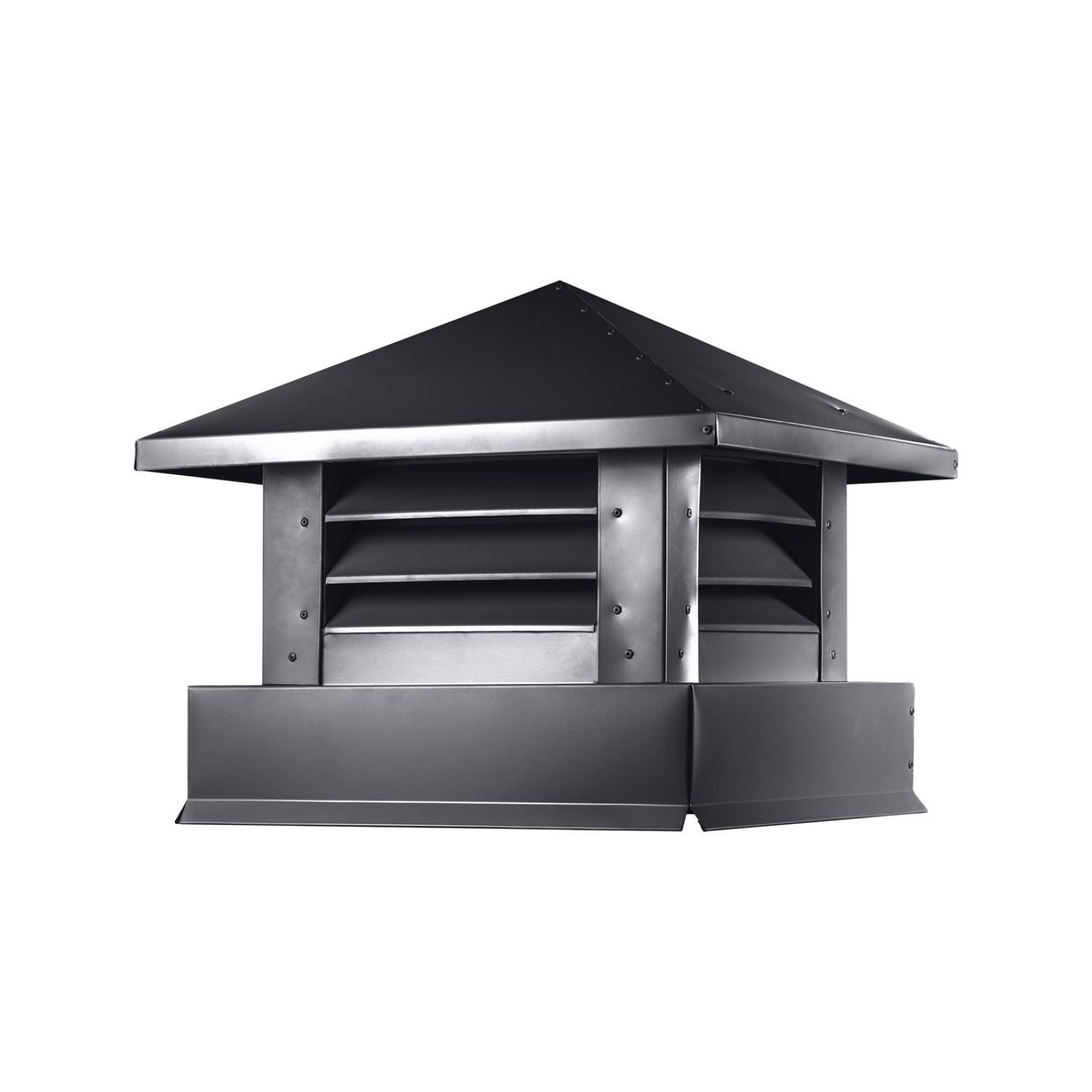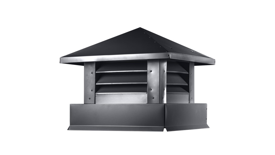 Форма «Аэро» рассчитана на то, чтобы приподнятая над трубой крыша не зажимала выходящий поток и не создавалась «пробка» по дыму. При этом закрытые с боков плоскости уменьшают задувание косого дождя и снега внутрь среза, что особенно важно на открытых продуваемых участках кровли.