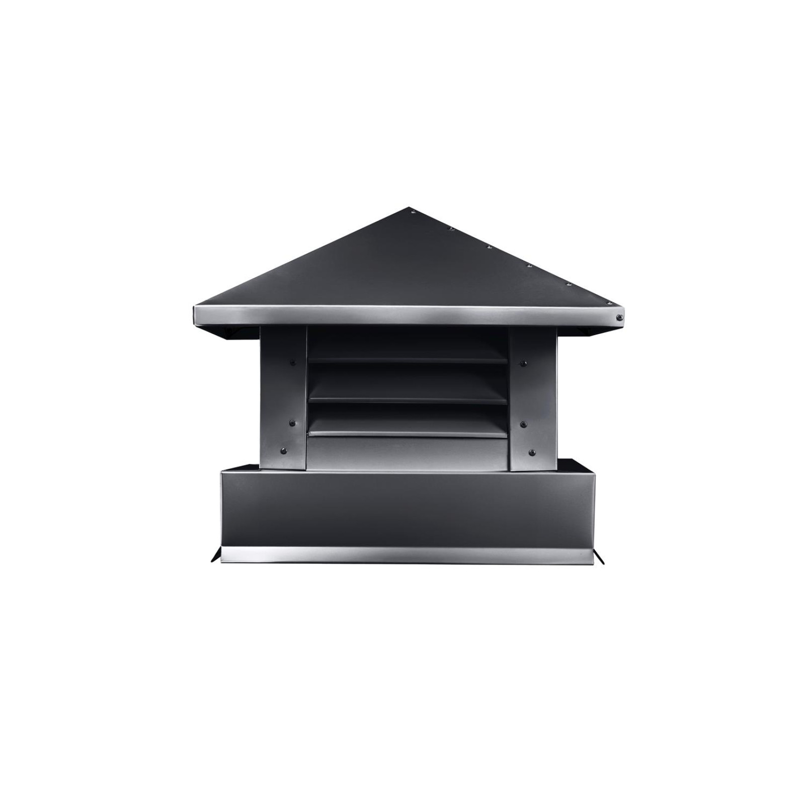 Основная задача дымника – перекрыть прямой путь воде, снегу, листве и птицам в дымоход, не мешая при этом нормальной тяге. За счёт выступающей кровли и щелей по периметру вода стекает по крыше дымника, а выходящий дым свободно уходит в атмосферу, не отбиваясь обратно в трубу.