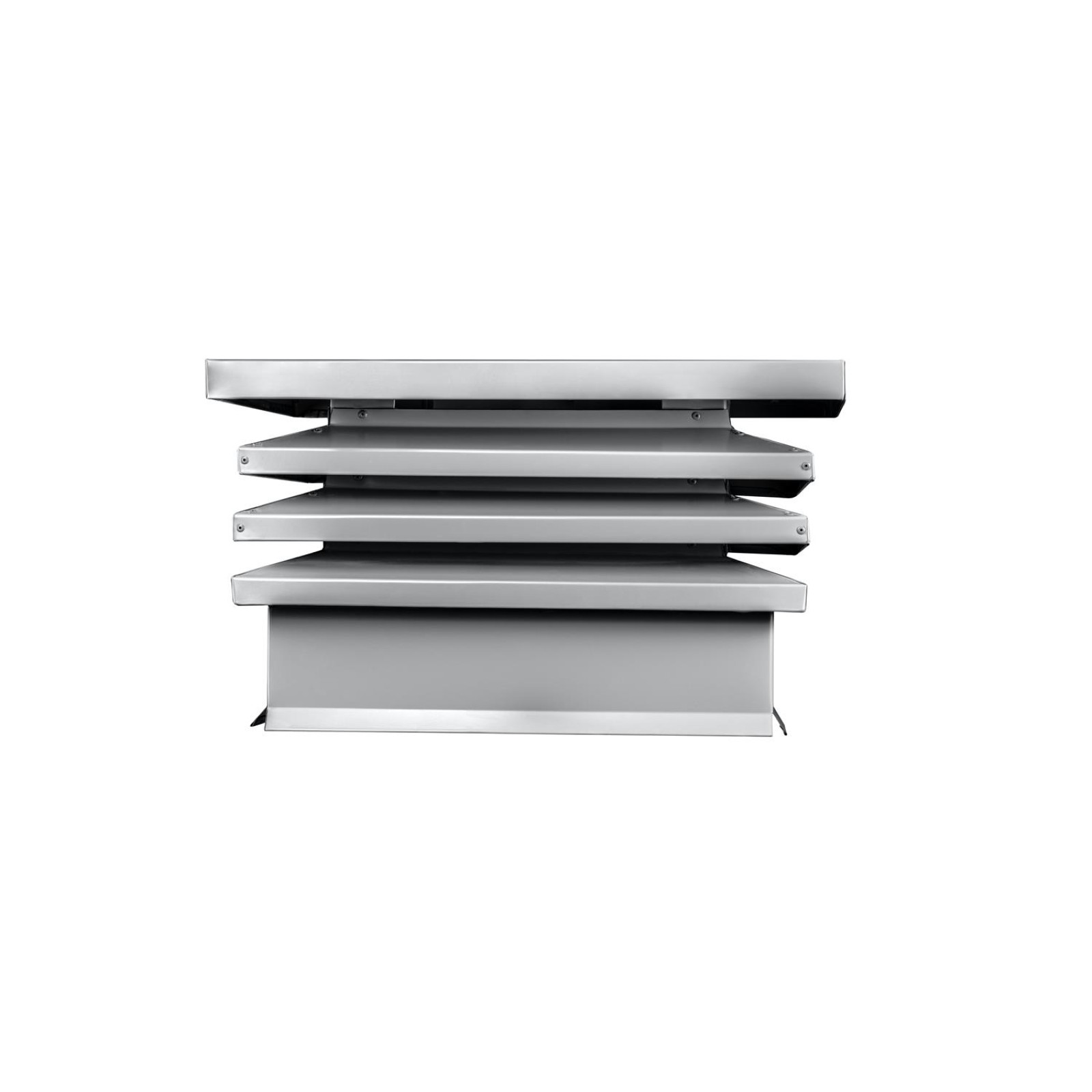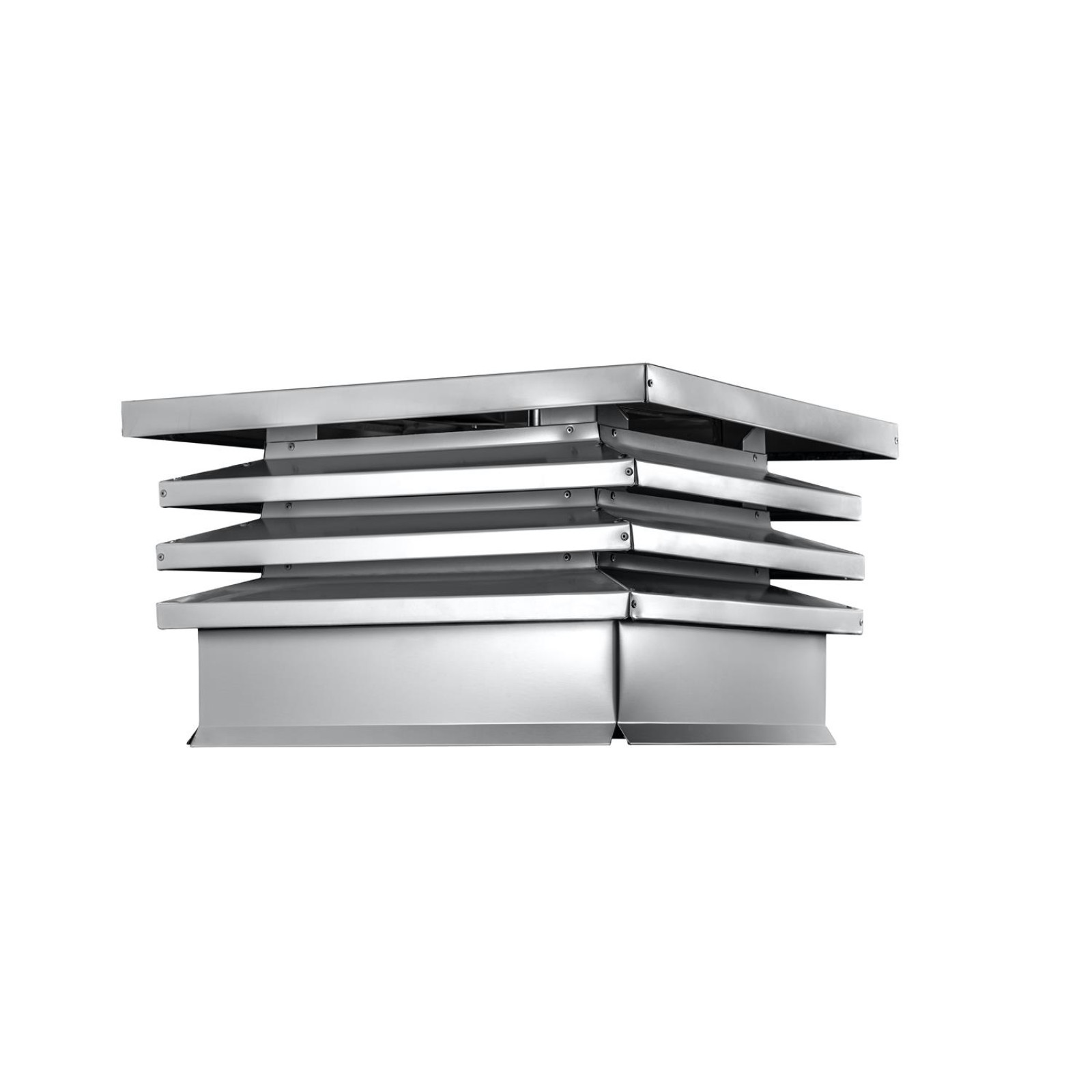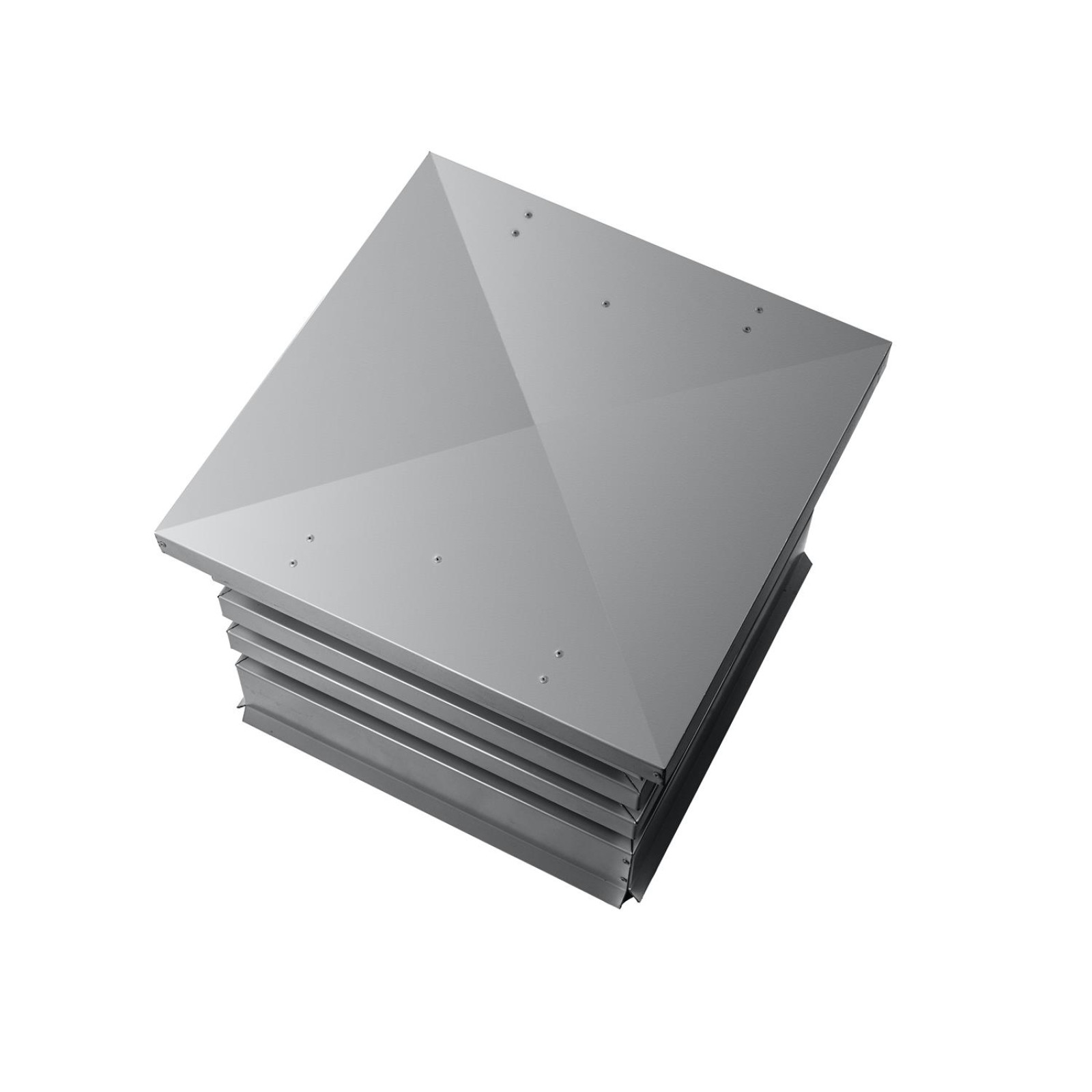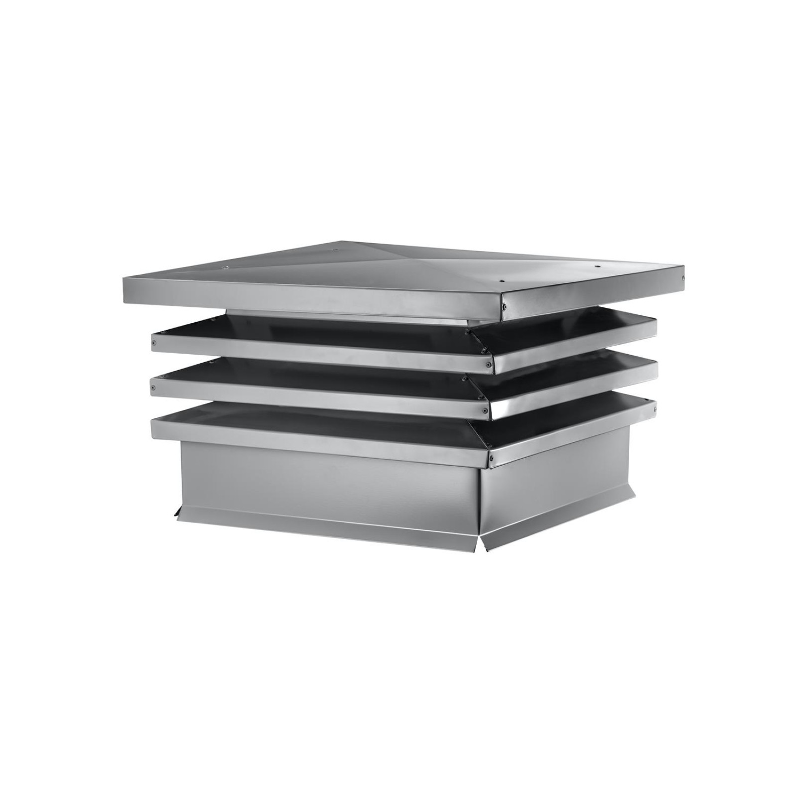Дымник «Хай?тек» с плоской крышей размером 520?520 мм относится к стандартной линейке колпаков для квадратных кирпичных дымоходов и вентиляционных каналов, перекрывая оголовок трубы с запасом по периметру для надежной защиты от осадков.