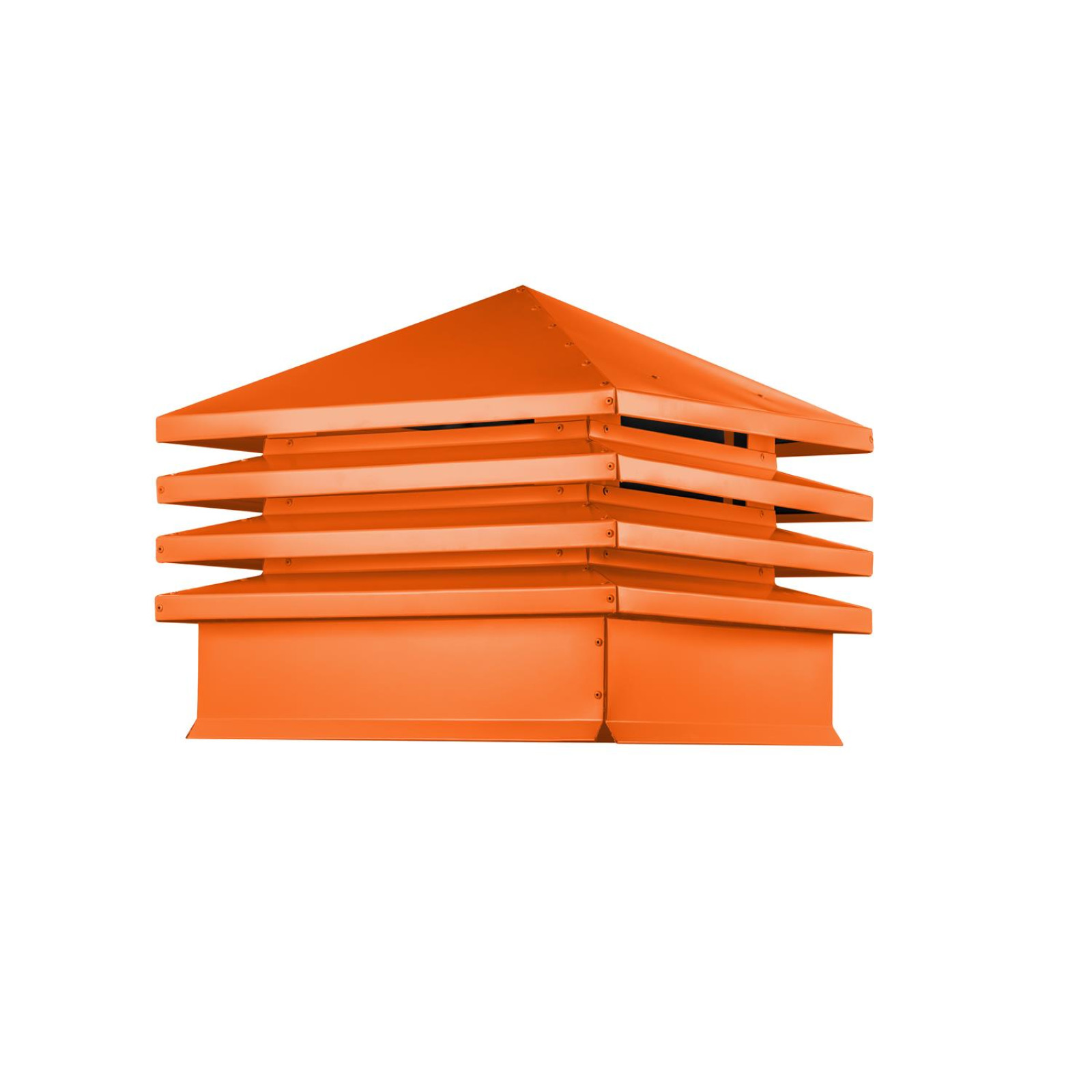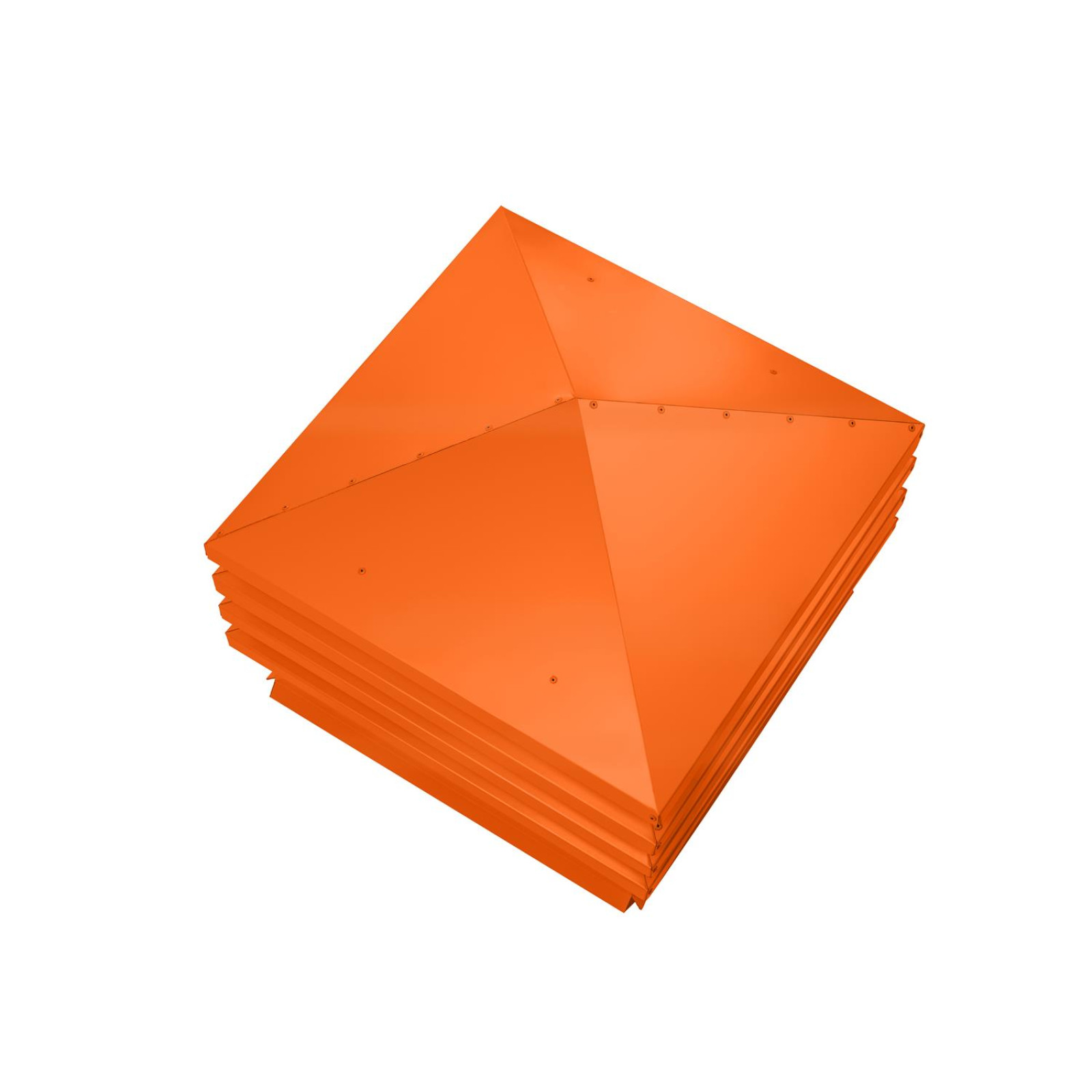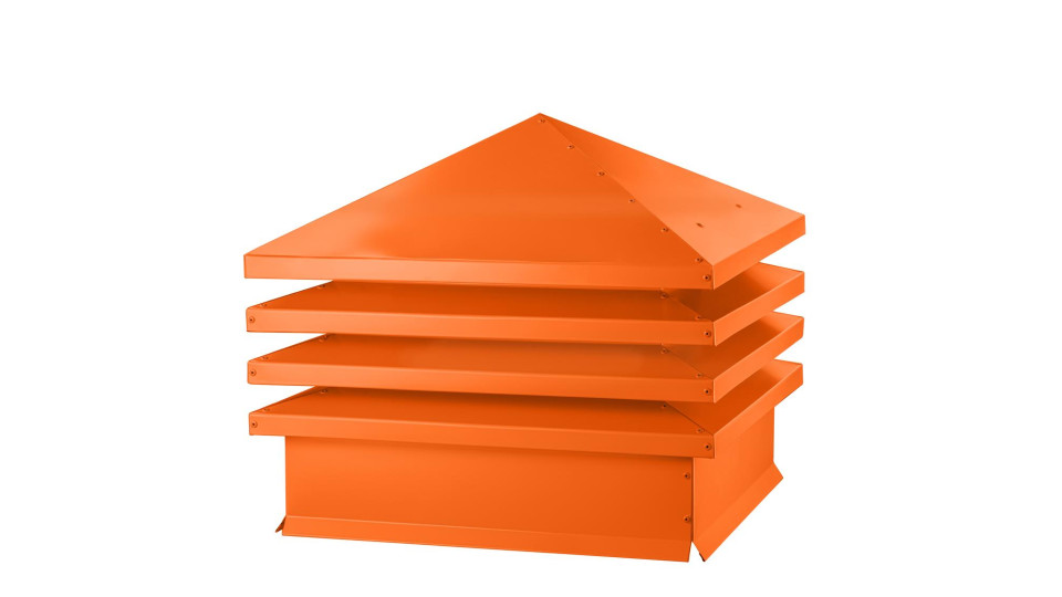 Дымник на трубу хай-тек со скатной крышей 390х390 мм в цвете RAL 2004 Оранжевый решает сразу две ключевые задачи: защищает кирпичный или бетонный оголовок от осадков и разрушения, а заодно придает крыше аккуратный современный акцент в едином цвете с кровлей и доборными элементами. Такой размер ориентирован на стандартные дымоходы около 380х380 мм по кладке, перекрывая их с небольшим запасом по периметру и закрывая уязвимые швы от влаги и обмерзания.