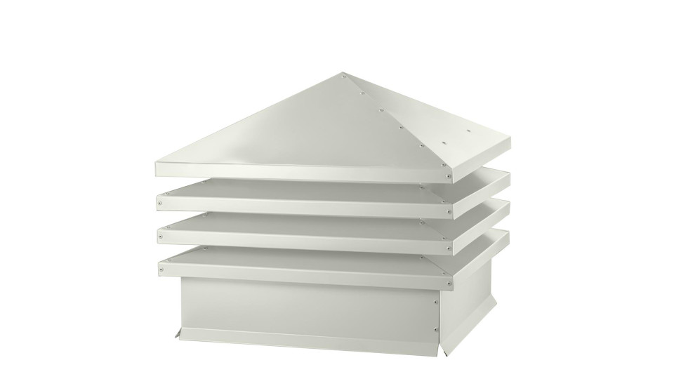 Толщина металла 0,5 мм обеспечивает сочетание прочности и легкости изделия, что позволяет дымнику сохранять форму при ветре силой до 17 м/с. По размеру 390х390 мм этот дымник надежно перекрывает выход трубы, обеспечивая защиту, как плотный «шоколадный квадрат» на кровле, а серо-белый оттенок подходит для большинства фасадов, создавая аккуратный и универсальный внешний вид.