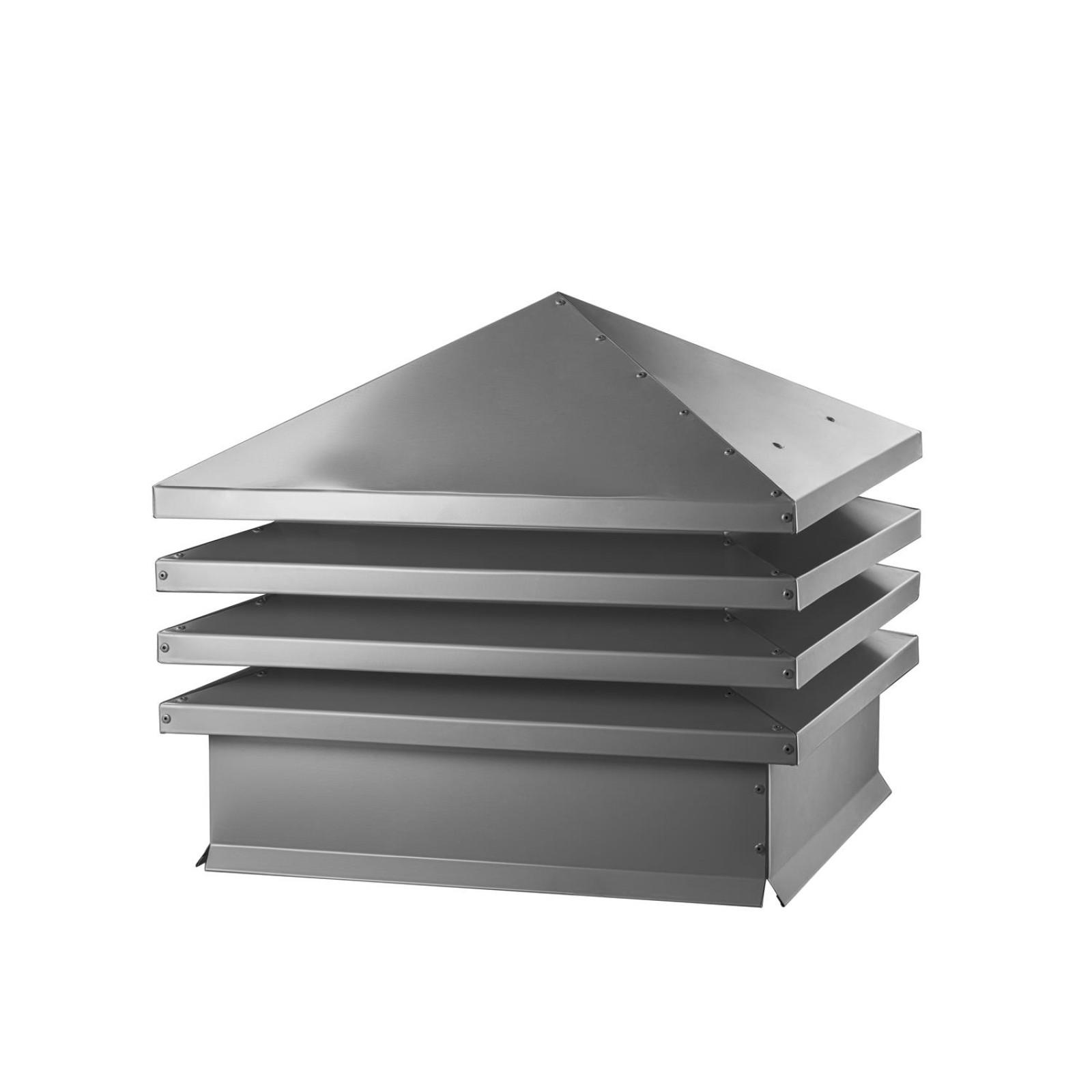 Размер 510х510 мм точно соответствует оголовкам труб из полутора кирпичей с каждой стороны — это как идеально подогнанный чехол, который полностью охватывает верхушку дымохода шириной около 51 см, не сужая проходное сечение и не мешая выхлопу газов. Юбка высотой 80-100 мм плотно надевается на трубу, фиксируясь собственным весом без сверления, что упрощает монтаж даже на высоте. Толщина стали 0,45-0,5 мм с полимерным покрытием Satin или PE выдерживает ветер до 40 м/с и служит 10-15 лет, словно щит от коррозии, снега и ультрафиолета.