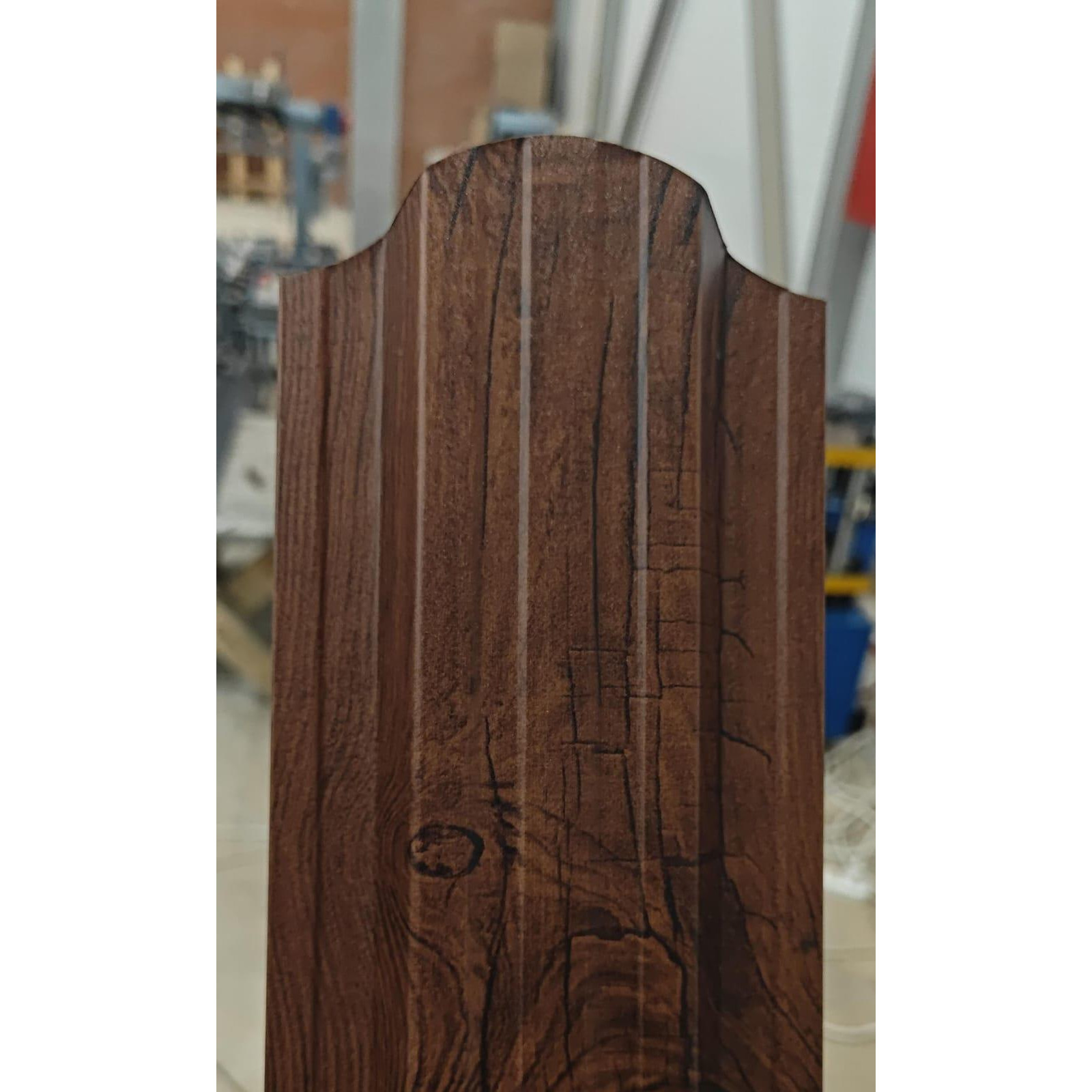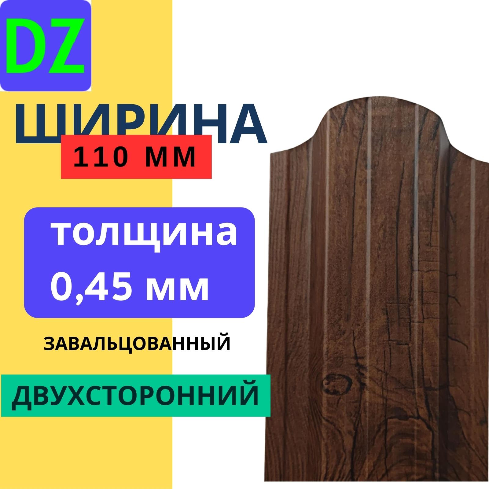 П-образный профиль шириной 110 мм из стали 0,45 мм с двусторонним покрытием «Print» под дерево (25 мкм) сочетает натуральный «морёный дуб» с антикоррозионной защитой Zn 100 г/м и гарантией до 15 лет. Замковый срез исключает щели и перекосы при монтаже, а двусторонний рисунок сохраняет реалистичный вид ограждения с обеих сторон.