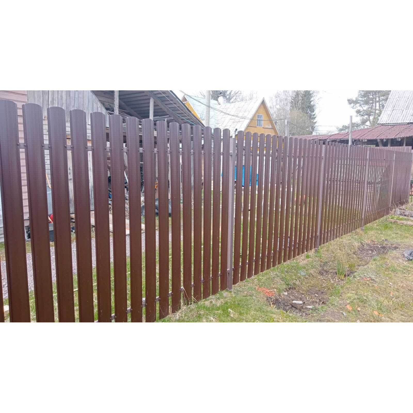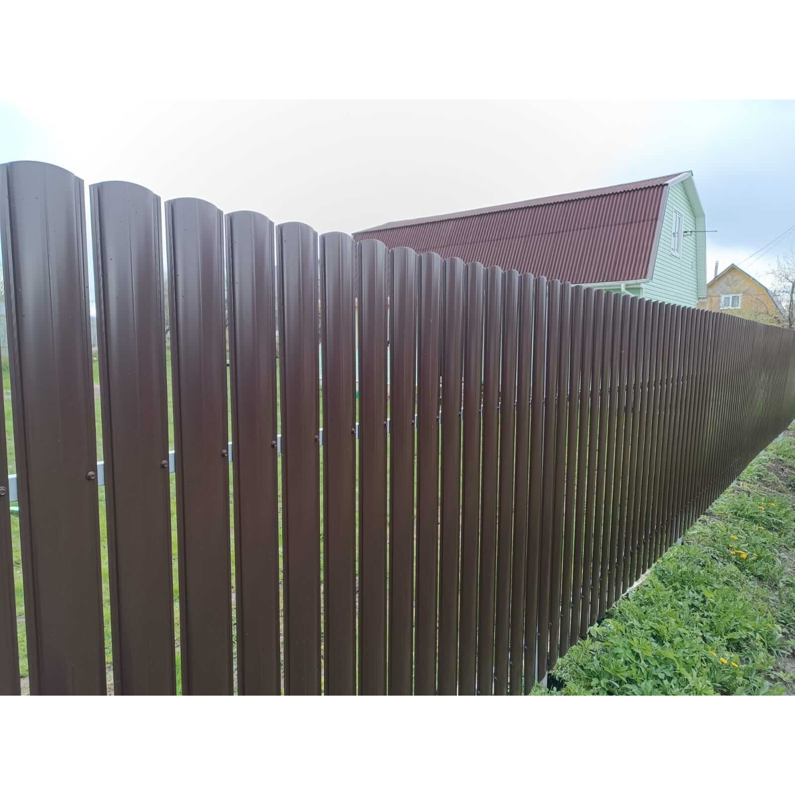 Полукруглый профиль шириной 122 мм из стали 0,45 мм с двусторонним полиэстерным покрытием 25 мкм RAL 8017 сочетает тёплый «шоколадный» оттенок с антикоррозионной защитой Zn 100 г/м и гарантией до 15 лет. Двусторонняя окраска сохраняет насыщенный цвет внутри и снаружи, а полукруглая форма придаёт забору мягкий силуэт и повышенную жёсткость.