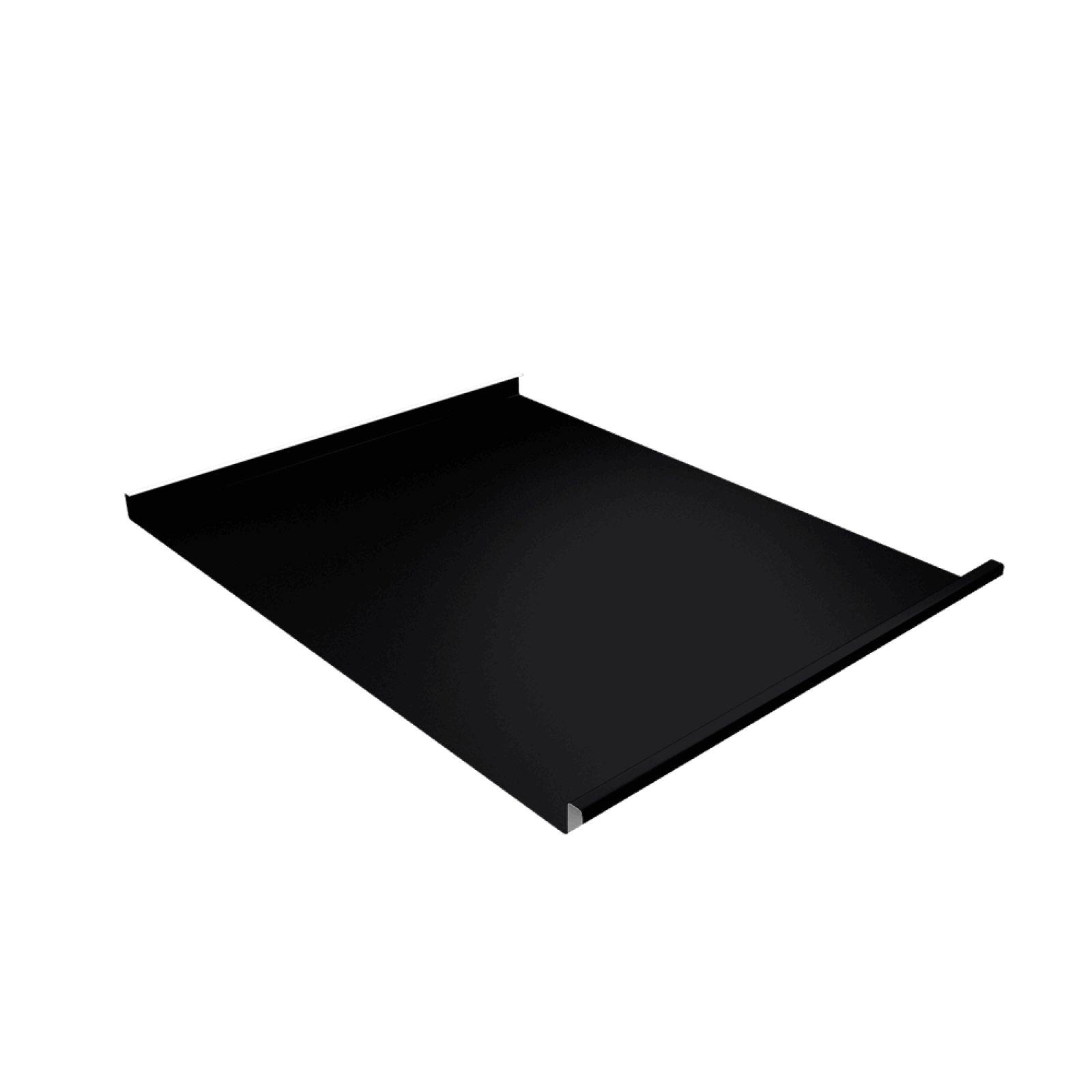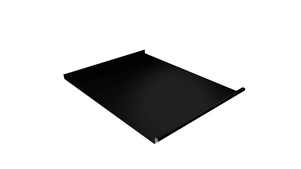 Двойной стоячий фальц толщиной 0,45 мм в глянцевом полиэстере — лёгкий, но стойкий материал, где глубокий чёрный оттенок маскирует пыль и придаёт дому строгий силуэт.