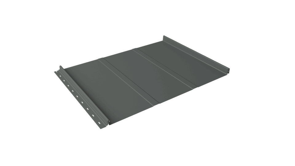 Глянцевый полиэстер 25 µm ложится на сталь 0,45 мм и защёлкивается скрытым клик-замком: панели образуют ровную серую плоскость без единого самореза на виду. Оттенок RAL 7005 «мышиный серый» подчёркивает бетон, стекло и натуральное дерево, а гладкая поверхность отражает свет точечно, без слепящих бликов.