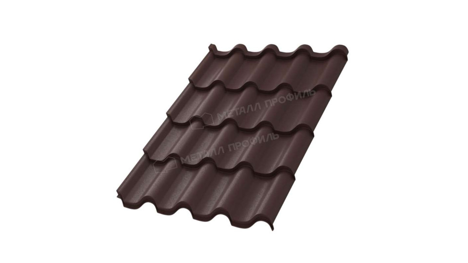 Эта металлочерепица выделяется высоким профилем с плавными линиями, имитирующими натуральную черепицу, и подходит для крыш от величественных особняков до компактных построек, подчеркивая архитектурную мощь и стиль.