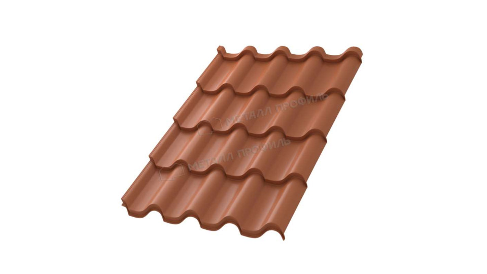 Металлочерепица Монтерроса-XL NormanMP PE-01 RAL 8004 «Терракотовый» — кровля для тех, кто хочет придать дому атмосферу солнечной Италии и подчеркнуть масштаб замысла настоящей “архитектурной поверхности”. Сочетание крупной волны XL-профиля, жизнерадостного терракотового оттенка и максимальных габаритов листа станет выигрышным акцентом и для стильного коттеджа, и для крупного загородного объекта.