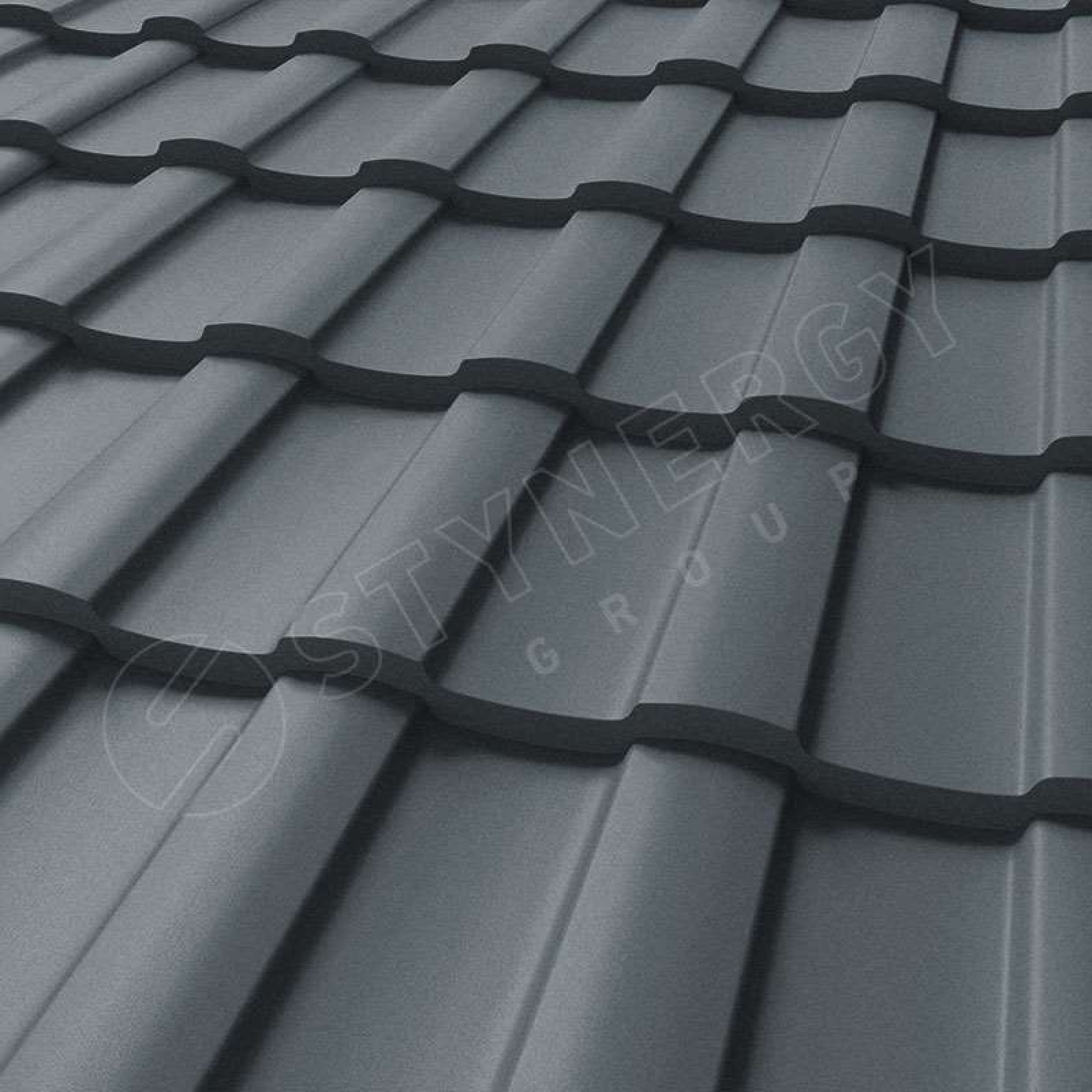 Металлочерепица Stynergy Stella Corundum50 матовый RAL 7011 (железно-серый) — кровельный материал для продвинутых застройщиков, архитекторов и владельцев, ценящих строгую элегантность и технический ресурс на десятилетия. Железно-серый оттенок в современном матовом исполнении и мужественный профиль Stella «под камень» делают крышу универсальной акцентной частью фасада на фоне любых материалов — бетона, дерева или стеклянных вставок.