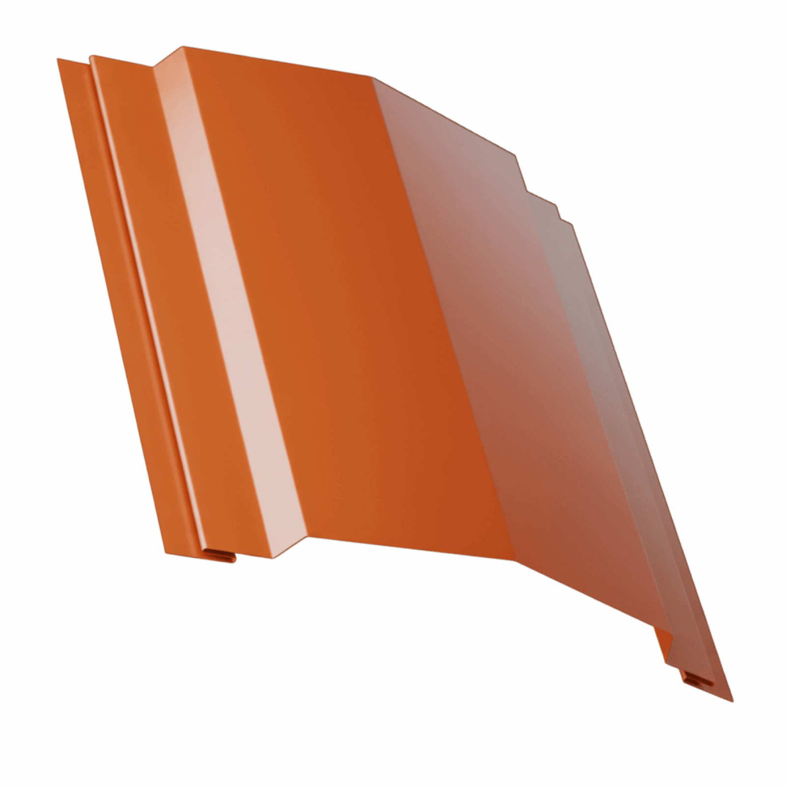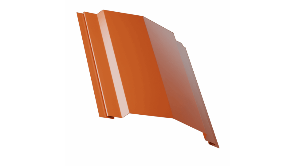 Планка конька для сэндвич-панелей 0,45 PE RAL 2004 закрывает верхний стык скатов кровли, защищая утеплитель и металл от влаги, снега и пыли и одновременно придавая крыше аккуратный законченный вид. Яркий оранжевый цвет по шкале RAL 2004 позволяет поддержать фирменный стиль фасада или выделить кровлю на фоне стандартных серых и коричневых зданий.