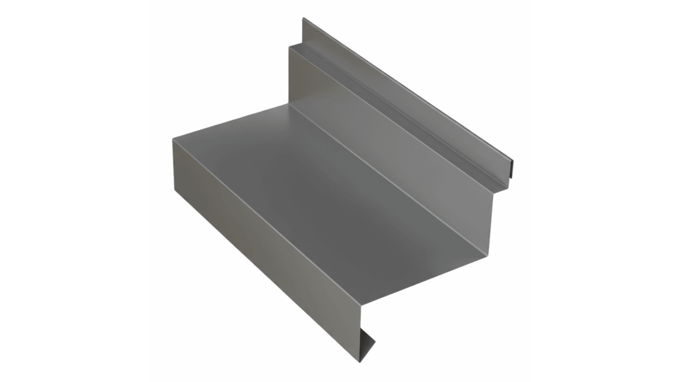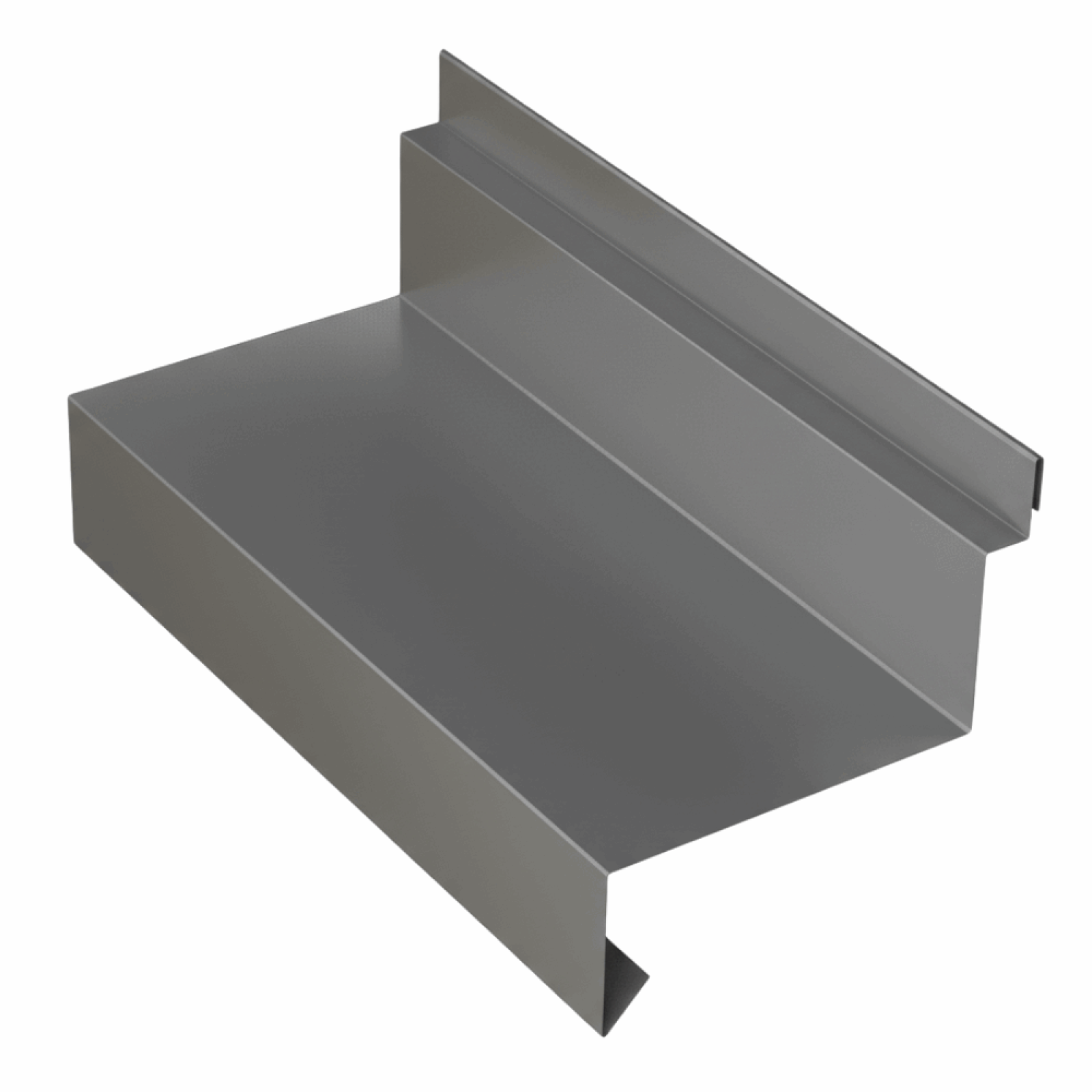 Цокольный отлив подобного типа применяют в узлах примыкания стеновых сэндвич?панелей к фундаменту или цоколю, а также при монтаже фасадных систем и ограждений из панелей. Он перекрывает линию контакта панели и основания, направляя воду наружу и защищая утеплитель и нижнюю зону стены от намокания.