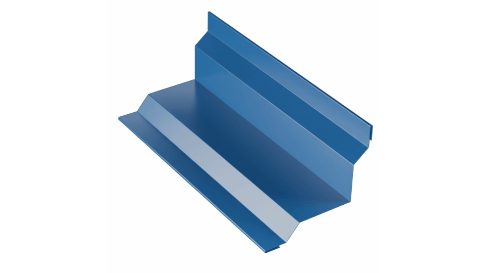 Лицевая поверхность окрашена в глянцевый RAL 5005 «сигнальный синий», что позволяет сочетать планку с кровельными и стеновыми материалами того же оттенка и создавать яркие фасадные решения. Глянцевый блеск визуально освежает плоскость и делает углы более выразительными, особенно на светлых или нейтральных фоновых цветах. Обратная сторона имеет эпоксидное серое покрытие, которое служит дополнительной защитой металла со стороны утеплителя и внутренних поверхностей, где элемент соприкасается с панелями и подсистемой.
