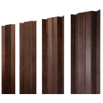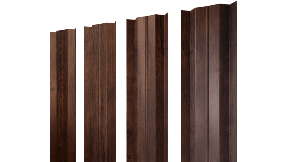 Шесть продольных рёбер формируют Twin-коробку — жёстче классического M-профиля, но визуально «стройнее». Полиэфирное покрытие Print Premium 25 µm печатает живую *текстуру вишнёвого сердцевика* на обе стороны планки: с улицы — тёплый шоколад, со двора — светлый TwinColor. Фигурный купол придаёт верхнему краю мягкий ритм, а оцинкованная сталь толщиной 0,45 мм избавляет от кисти и антисептика.