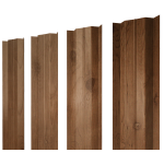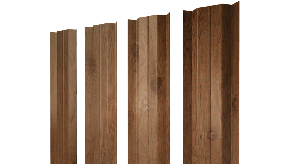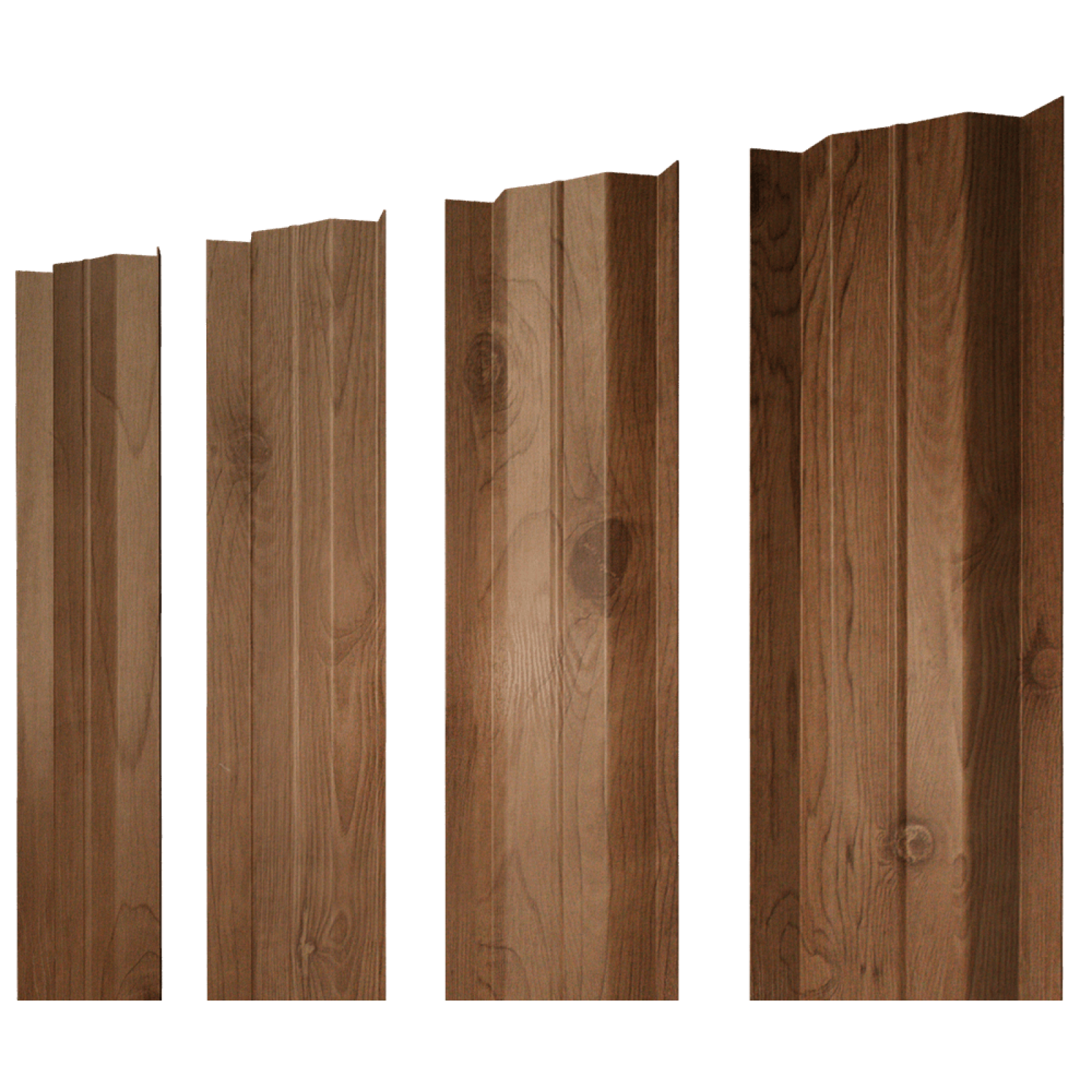 Шесть граней жёсткости складываются в M-V-коробку, сравнимую по прочности с прямоугольной балкой, но расход металла остаётся минимальным. Снаружи — трёхслойная печать Print Premium 25 µm с фотореалистичной сосновой текстурой; внутри — оцинкованная сталь 0,45 мм. Рисунок отпечатан на обеих сторонах, поэтому ограждение «лицевое» со всех ракурсов, а прямой верх готов к установке П-планки и не задерживает снег.