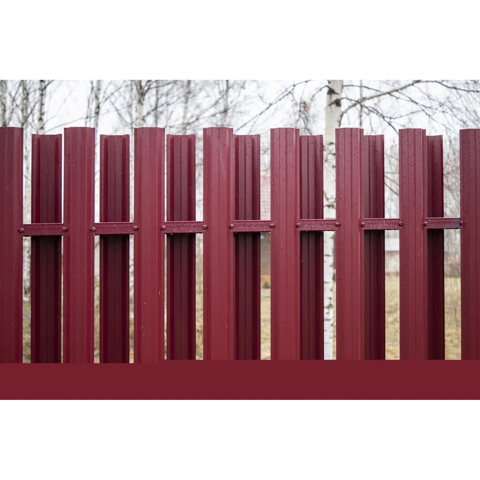 Насыщенный «красное вино» RAL 3005 с глянцевым полиэстером придаёт забору благородный акцент, подчёркивая кирпичные фасады и тёплые оттенки ландшафта. Чёткий P-профиль с прямым резом и каналом на центральной части создаёт рёбра жёсткости, а стальной лист толщиной 0,4 мм остаётся лёгким для монтажа и устойчивым к ветру.
