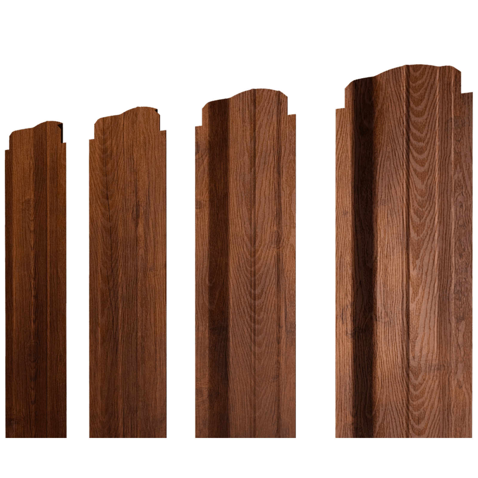 Штакетник изготовлен из оцинкованной стали толщиной 0,45 мм с двусторонним полимерным покрытием Print-Double Premium, что обеспечивает защиту от коррозии и привлекательный внешний вид с обеих сторон.