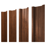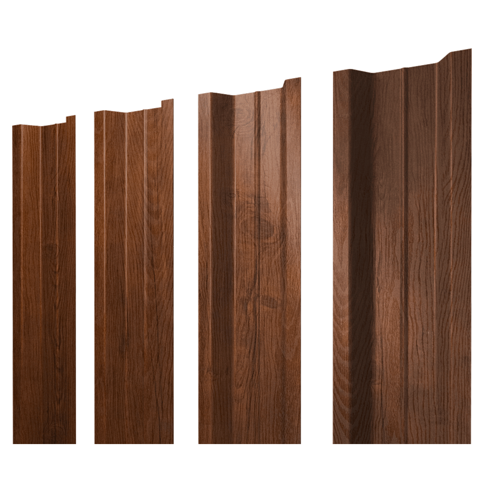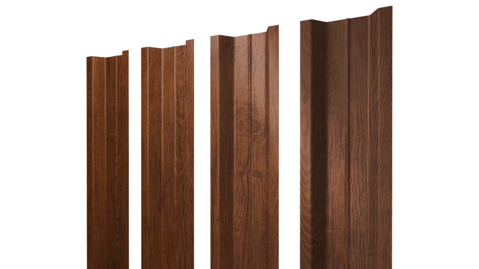 Штакетник изготовлен из оцинкованной стали толщиной 0,4 мм с двусторонним полимерным покрытием Print Premium, имитирующим структуру натурального дерева. Это обеспечивает защиту от коррозии и долговечность внешнего вида.